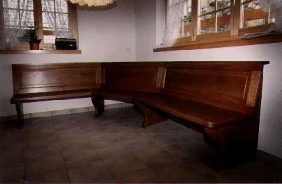 Diese Eckbank ist aus aus massivem Eichenholz gezimmert und gebeizt; sie gehört